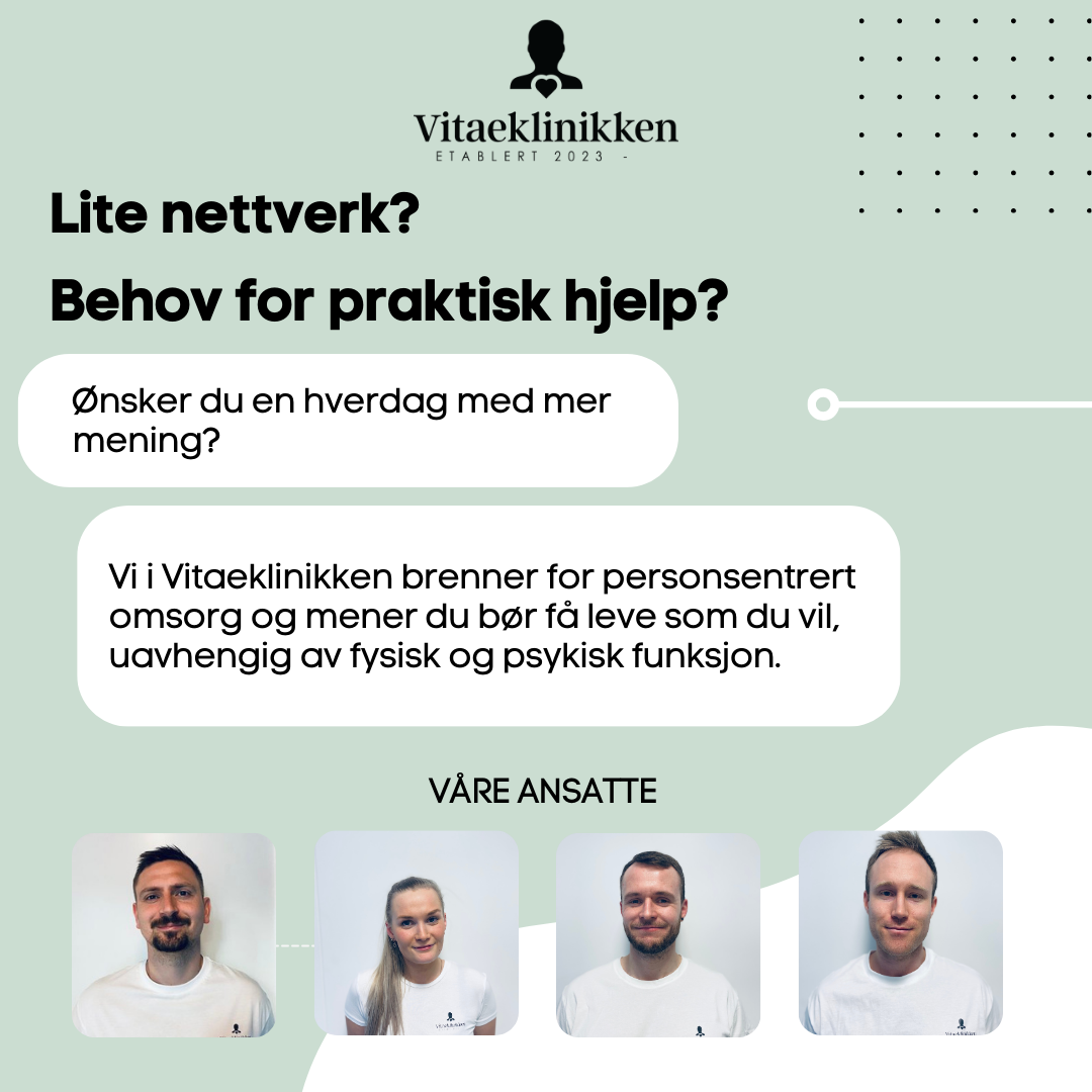 Har det begynt å bli utfordrende å gjennomføre daglige aktiviteter eller savner du noen å dele kaffen med? Vi i Vitaeklinikken brenner for personsentrert omsorg og mener du bør få leve som du vil, uavhengig av fysisk og psykisk funksjon!